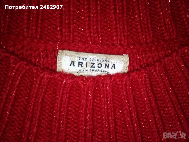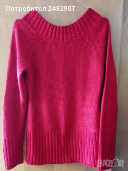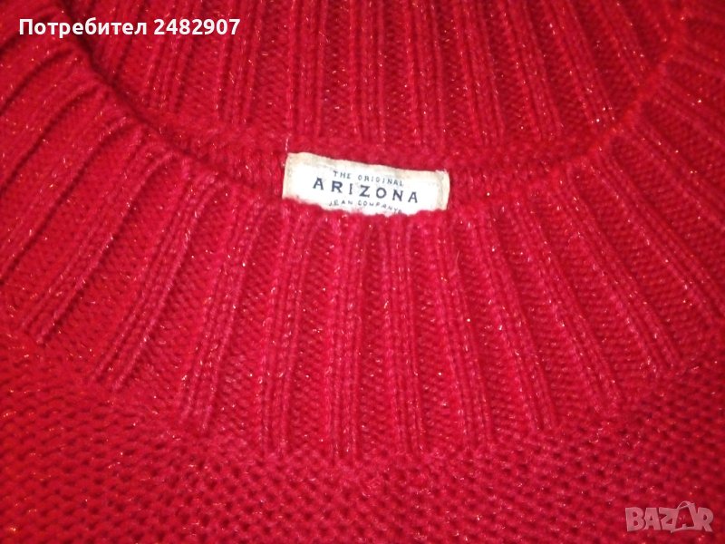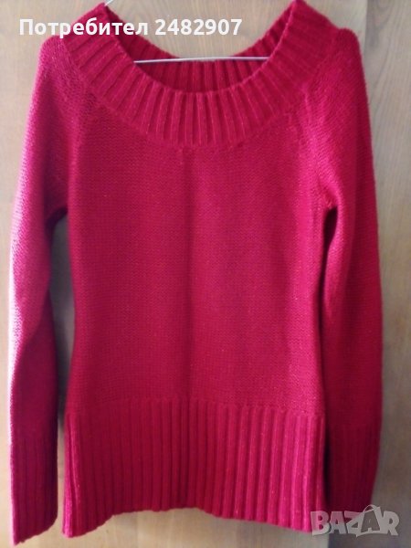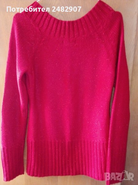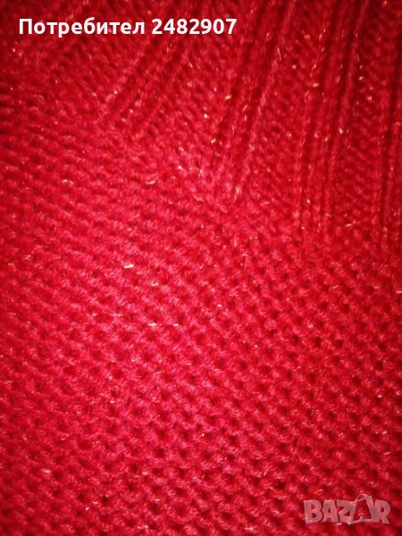 Машинно плетен дамски пуловер в червено, с блестящи червени нишки, размер М. Ширина под мишниците - 45 см, ширина в долната част - 43 см, дължина от рамото до долу - 66 см, дължина на ръкава от деколтето - 75 см, ширина на ръкава в долната част - 9 см. Много запазен, почти не е използван, отлично състояние, без забележки.