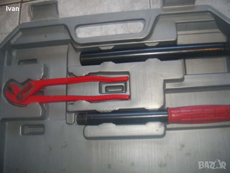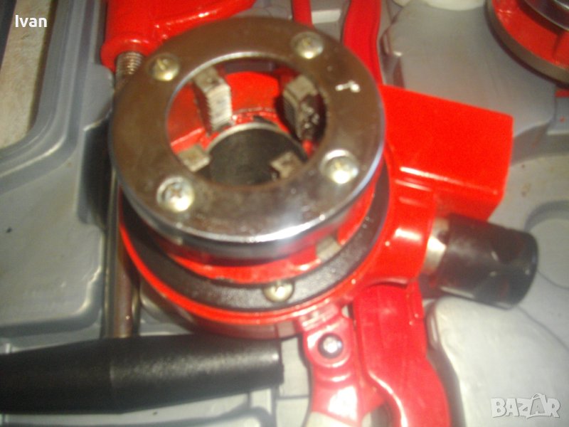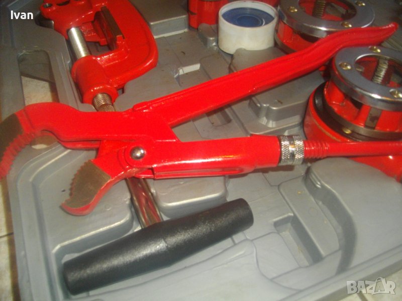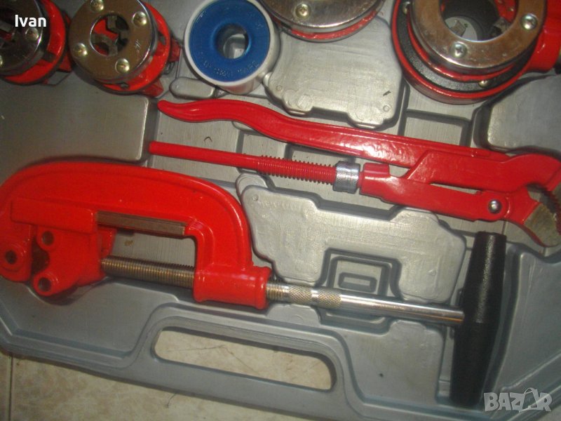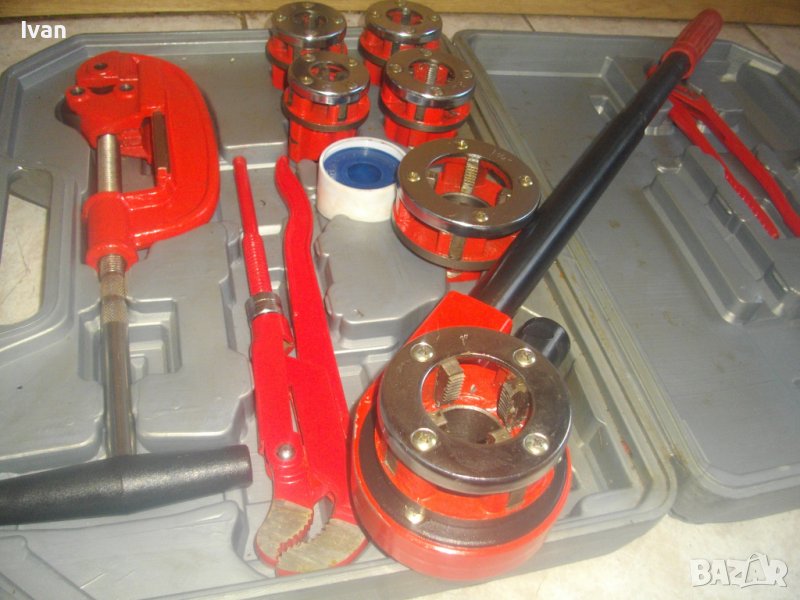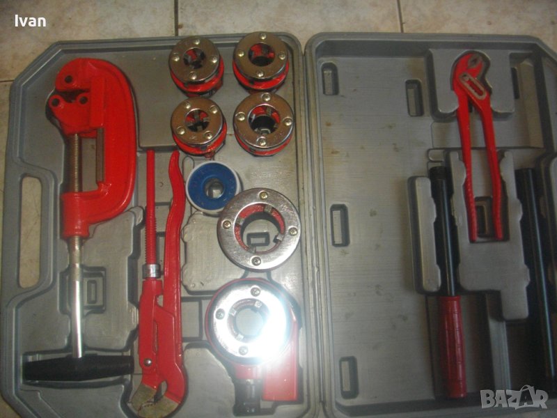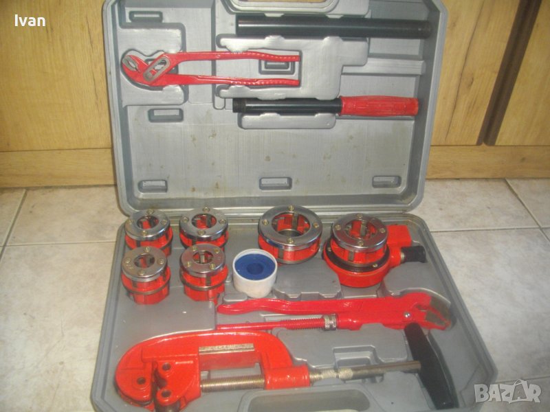 ОПИСАНИЕ на резбонарезен комплект - 399 лв. (204.01 €). Плашка/винтонарезка/винторезка/винторез за направа на външни резби на метални водопроводни тръби с размери от 3/8 цол до 1 1/4 цол. Комплекта е съвсем нов, неизползван и неупотрубяван. Прдполагам немски или френски. Маркировки по куфар и инструменти - PTTE - PE - HD. Комплектът включва тресчотка нова резбонарезна държач за резбонарезни глави с 2 реезбови тръби за дръжки, всяка по 27 см. Глава на тресчотката 15 см височина, диаметър ф 55 мм. 6 бр. нови рзбонарезни глави за плашката тресчотка - размери от 3/8 до 1 1/4 цол.