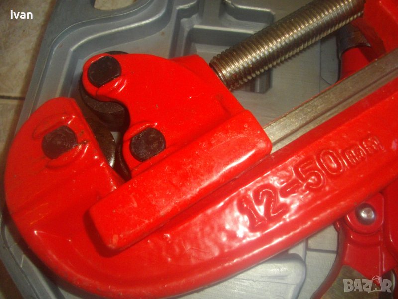 Тръборез нов за рязане на пластмасови тръби голям размер 15-50 мм, с два лагера за легло на поставената тръба от закалена инструмнтална стомана и голям резец ф 30 мм.