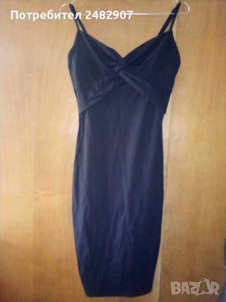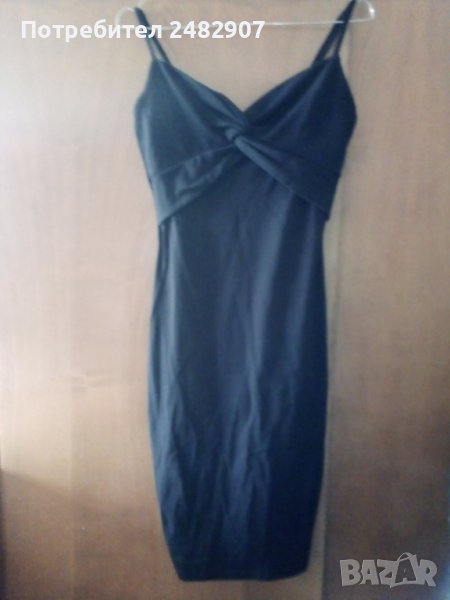 Елегантна черна дамска рокля с тънки регулируеми презрамки и ефектно деколте, размер S. Ширина под мишниците - 37,5 см, ширина в долната част - 31 см, дължина от горната част на презрамките до долу - 91 см. Съдържа 95 % памук и 5 % еластан. Обличана е веднъж за повод, отлично състояние, без забележки.