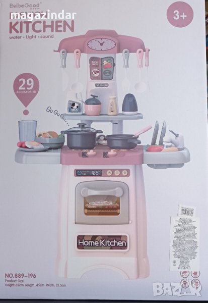 Функции: светещи котлони, реалистичен звук на приготвяне на храна, отваряема врата на фурната, подвижно кранче на мивката (без течаща вода).