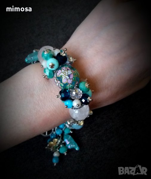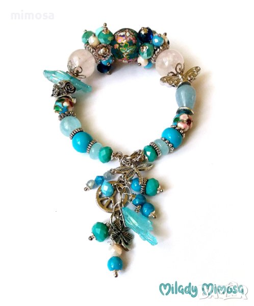 Гривната е направена с аквамарин, розов кварц, титаниев кварц, чешки кристали, стъклени мъниста, емайлирани метални мъниста и сребристи компоненти върху твърда мемори тел.