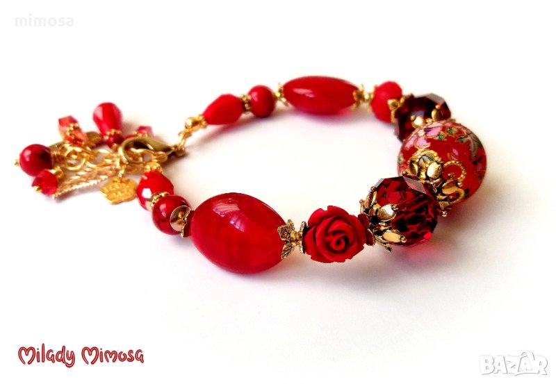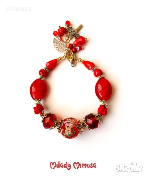 Гривната е направена с кристали, стъклени мъниста "lampwork", акрилни мъниста и златисти компоненти върху твърда мемори тел.
