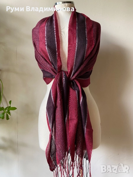 Тъмночервен шал на райета, с блестяща сребриста нишка, червеното е в два нюанса, бордо и много тъмно, марсала червено, размер 178 Х 52 см, нов, доставка с Еконт.