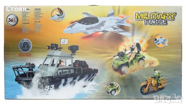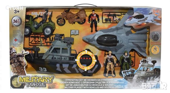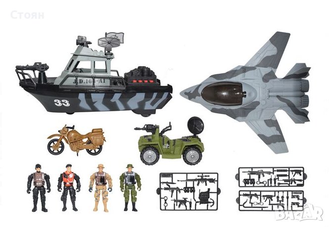Комплект военен боен кораб с реалистични бойни звуци и светлини. Заедно със самолет, джип и мотоциклет, оръжия и войници. Работи с 2 батерии тип AG13 (включени).