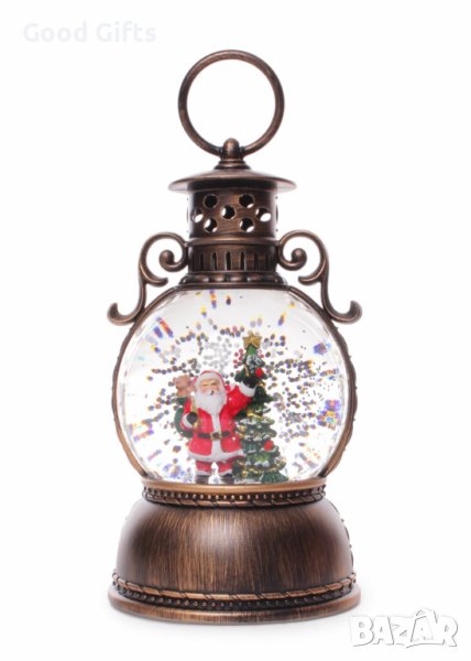 Музикално преспапие във формата на фенер с фигурка на Дядо Коледа и елха. Захранва се с 3 батерии АА (не са включени) или с USB кабел, който е включен към комплекта.