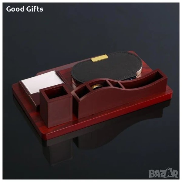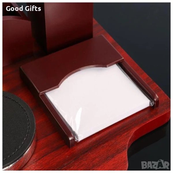 Луксозен органайзер за бюро, изработен от MDF материал. Органайзерът е с отделения за бележки, визитни картички, поставка за химикали и часовник. Предлага се в картонена кутия.