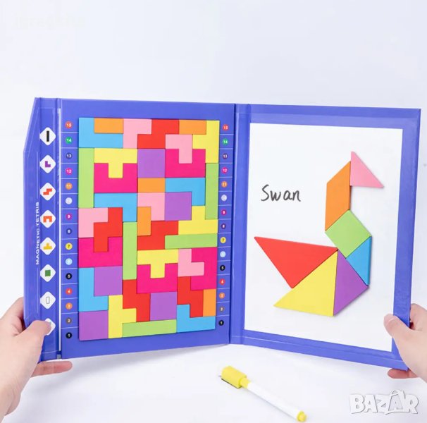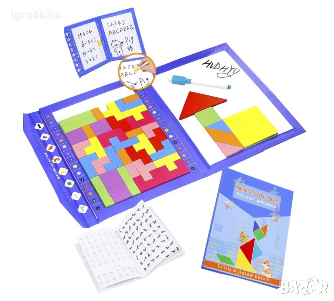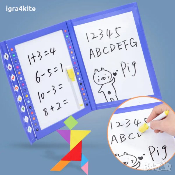 Предлагаме ви най-новата и иновативна детска дигитална магнитна тетрадка - Магнитната двустранна книга с маркер за писане и триене + дървени магнитни блокчета и магнитен танграм!
