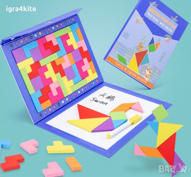 3в1 Магнитна книга за рисуване + магнитен дървен тетрис и танграм