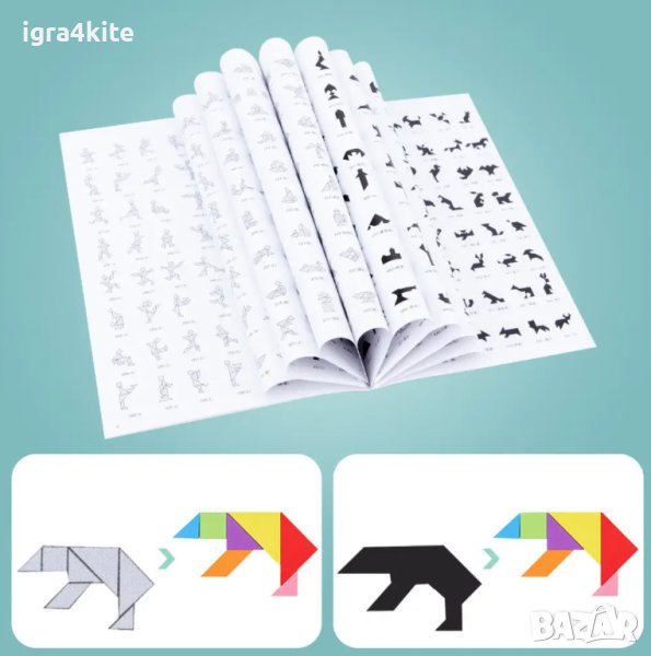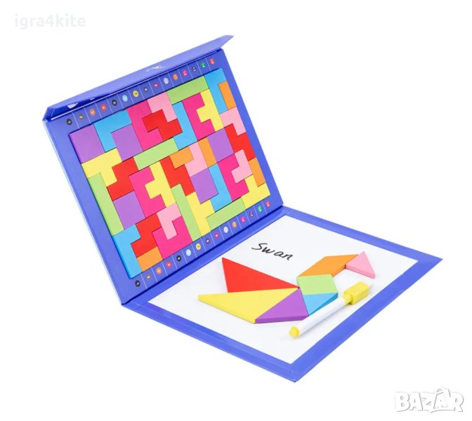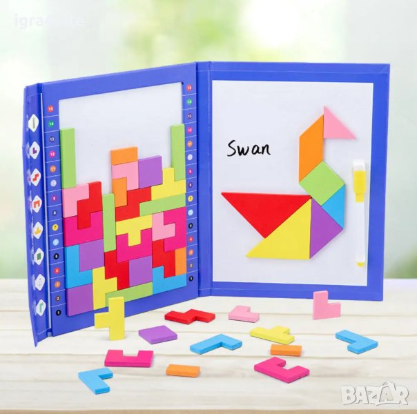 * 7 броя дървени магнитни танграми - невероятно интересна геометрична забава, която упражнява уменията за решаване на загадки.