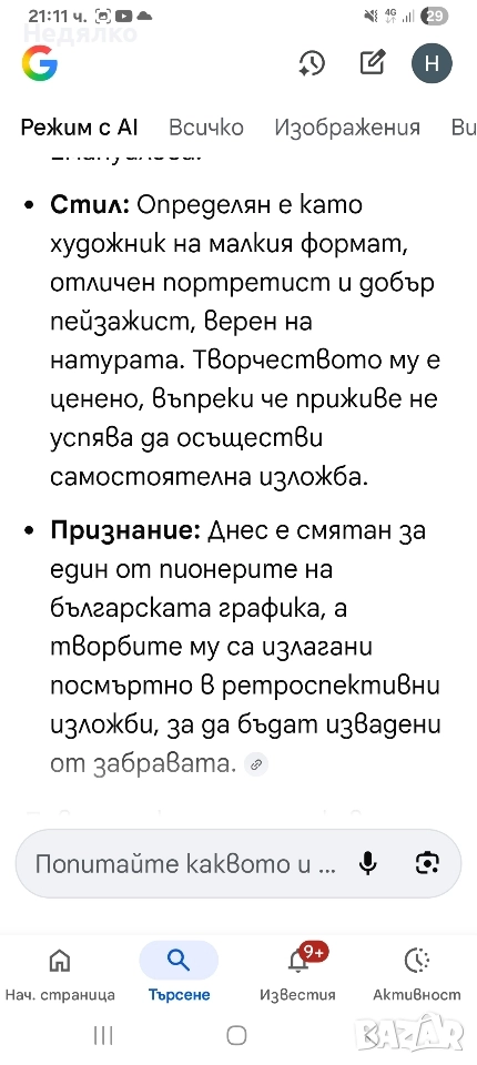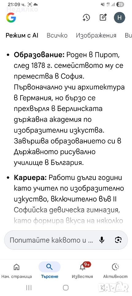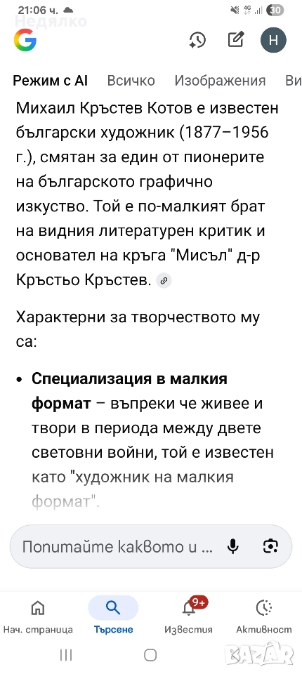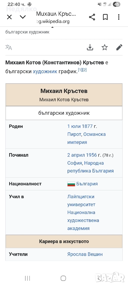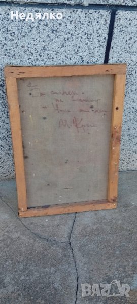 Михаил Котов(Константинов)Кръстев,1877-1956,масло на платно,период на изработка около 1947-1950г,70,5х49,5см,послание с подпис на гърба.Картината е за реставрация,има цепнатина в ляво около 5 см по вертикалата,и отлюспена боя,но,в предвид редкия художник,мисля,че си струва да бъде оценена подобаващо.