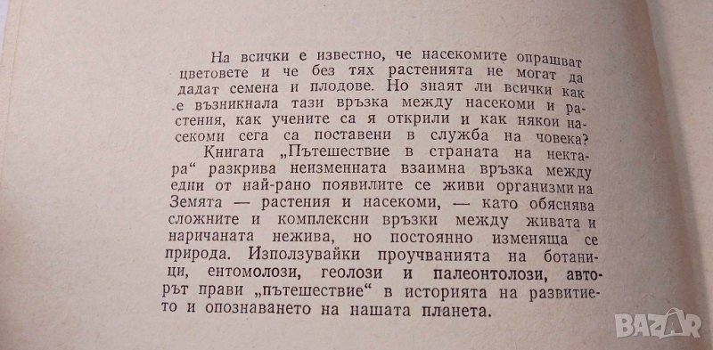 Научно-популярна книга, в която достъпно и интересно се разкрива невидимата връзка между цветята и насекомите. Книгата обяснява сложните и комплексни връзки между тях и природата. Дадени са и легенди за някои цветя. Книгата е издадена през 1981 г, 208 страници с илюстрации и текст, меки корици. Книжното тяло е в отлично състояние, забележки по корицата, на снимката се виждат.