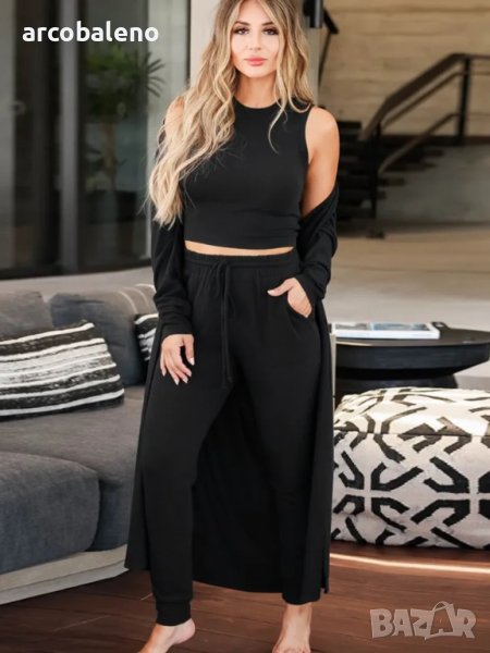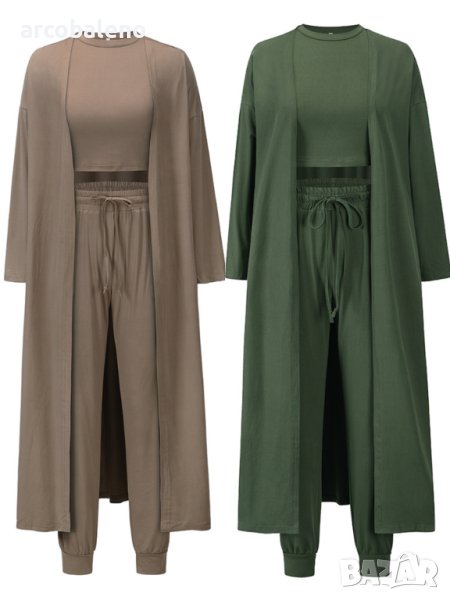 Дамски едноцветен комплект от три части, дамски топ + панталон и дълга жилетка
