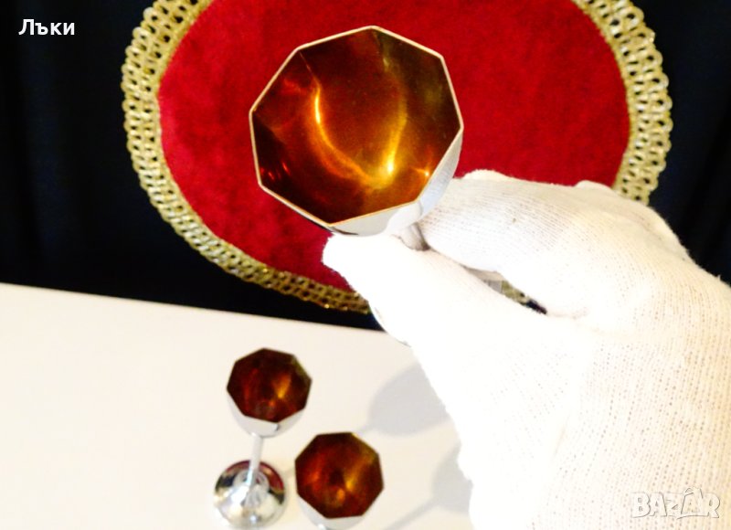 многоъгълен профил.От вън са посребрени и родирани,а от вътре са позлатени.Височина 11 см.,диаметър