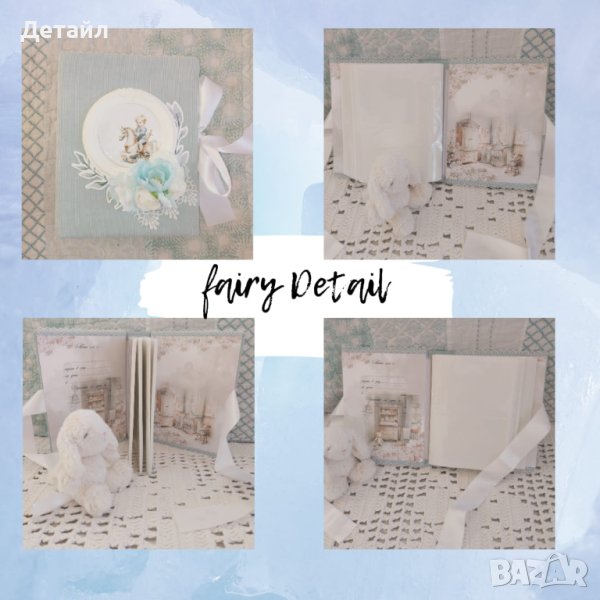 Представям ви изключително нежен бебешки албум. Има текстилни, мекички корици в бебешко син цвят, керамична рамка и текстилни цветя.