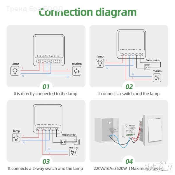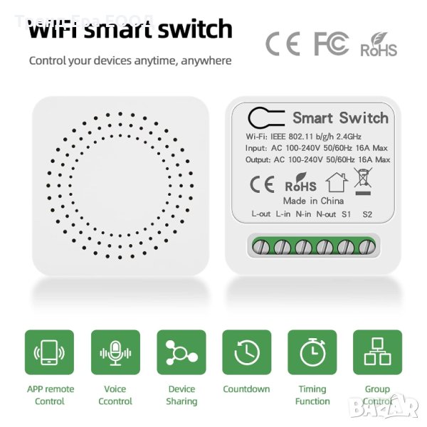 Smart Control: Изтеглете приложението "Smart Life", можете да включвате/изключвате чрез APP. Можете също така да споделите контрола със семейството и приятелите чрез приложението, за да осигурите допълнителен комфорт. WiFi превключвателят също е съвместим с конвенционални превключватели, където можете да свържете един/два конвенционални превключвателя, за да управлявате светлини или други устройства заедно.