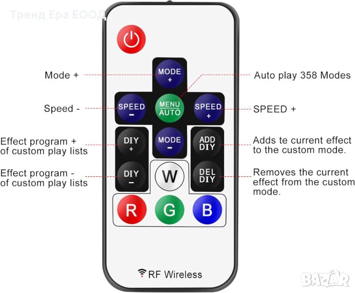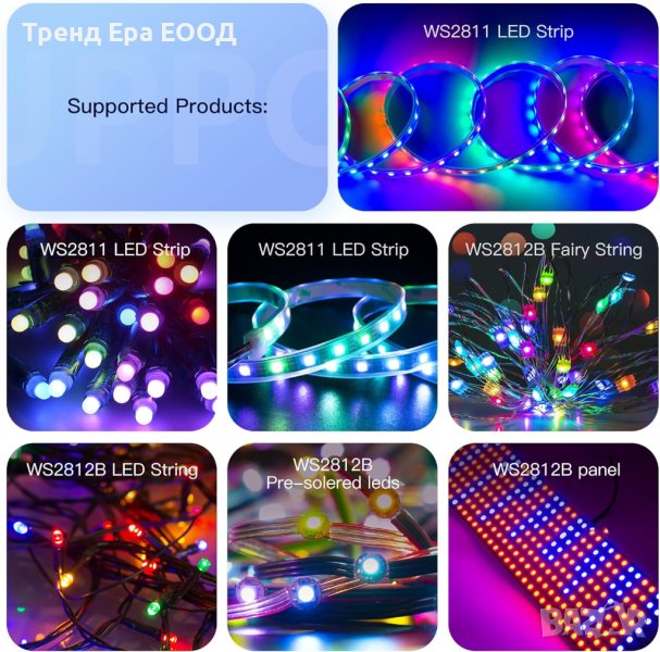 Поддържа WS2811 WS2812B LED светлини. Не може да контролира SK6812 RGBW LED светлини и обикновен RGB LED без драйвер IC. 300+ вида цветови режими, като дъга, вълна, дишане, стробиране, постепенна промяна, цветови цикъл, комета, статичен, избледняващ, преследващ, които са ярки и красиви. Скоростта на промяна на цвета и яркостта са регулируеми.