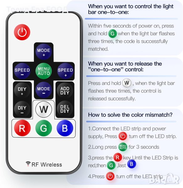 Светодиодното управление с 14 клавиша съдържа батерии с размер на монета. мини rf дистанционно управление. Ако контролерът е много горещ по време на употреба, моля, дайте светлинните ленти с отделно захранване или с помощта на усилватели. Предлага се с 3-пинов JST конектор и DC женски конектор. Поддържа всички LED продукти с 3 PIN единичен сигнал IC чип. Дистанционното може да съответства само на един приемник. Едно дистанционно също може да управлява много приемници. Просто включете и пуснете. Не е необходимо запояване. Автоматично запазване на потребителските настройки при изключване. Може да регулира реда на цветовете RGB GRB BRG и т.н. Когато натиснете зелено, светодиодът свети в червено. Това не е проблемът с качеството, моля, прочетете ръководството за потребителя и го настройте правилно.