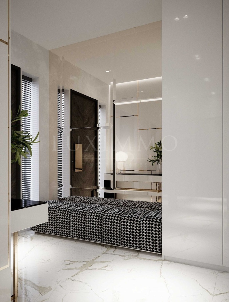 Апартаментът е разположен на 5-и етаж и предлага площ от 220 кв.м, функционално разпределена в антре, просторна всекидневна с кухненска част и излаз към тераса, спалня с дрешник и излза към тераса, две спални с обща тераса, баня с тоалетна, склад. Предлага се качествено завършен по Български Държавен Стандарт.