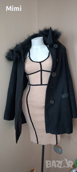 Роклята е универсален размер. Красиво стои, телесен цвят и черно.Обшичана веднъж за два часа, няма забежка. Роклята и палтото заедно 70 лв .