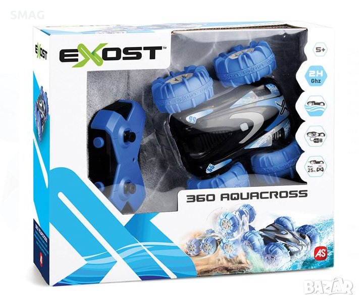 Невероятна 360 Aquacross RC кола от Exost за шофиране по суша, както и във вода! Има невероятно ускорение и 2,4 GHz система, която поддържа мултиплейър за още по-голямо забавление. Много издръжливи гуми, които поемат всички удари. Карайте от двете страни, така че нито едно препятствие да не го спре на суша или във вода!Има високопроходими гуми с амортисьори, двулицев корпус с градски дизайн, светлинен индикатор, система за управление на движението, обхват 25м, в син цвят. Преодолейте всички препятствия! Пакетът включва: 1 кола с дистанционно управление Exost, 1 контролер и 1 книжка с инструкции. Захранва се от 1 DC 3.7V/9W 500mAh акумулаторна батерия за автомобила (включена) и 2 AAA батерии за контролера (не са включени).