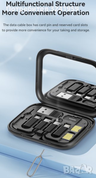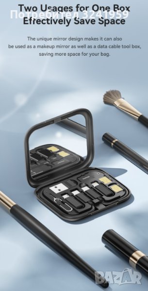 Кутията ефективно спестява място, като е структурирана така, че да можете да подредите кабелите и конекторите, осигурявайки си бърз и удобен достъп до тях. Предвидени са и места за 2 нано SIM карти и 1 TF карта. Също така е пригодена да я ползвате и като държач за телефона Ви, а дамите могат да ползват вграденото огледалце като огледало за грим, спестявайки повече място във Вашата чанта.