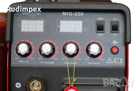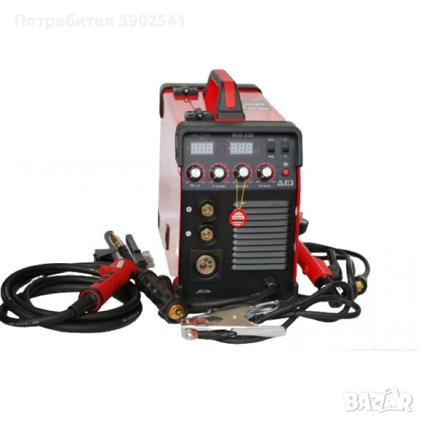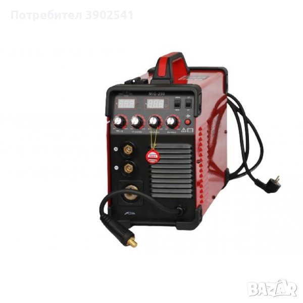 MIG-250 е заваръчен апарат подходящ както за любителска, така и за професионална употреба. Преди експлоатация, или обслужване на апарата, прочетете ръководството за експлоатация и го запазете за бъдещи справки. Този заваръчен апарат може да работи в режим MIG и MMA. IGBT захранването с уникален контролен режим подобрява надеждността на апарата. Мощният работен цикъл позволява продължителна заваръчна работа. Управлението с обратна връзка със затворен контур, стабилният изходящ волтаж позволяват работа при ± 15% флуктуации на захранващият волтаж. Регулируеми заваръчен ток и волтаж, отлични заваръчни характеристики. Използването на уникален динамичен контрол на характеристиките на управляващата платка осигуряват стабилна заваръчна дъга, малко пръски, отличен шев и висока ефективност. Премахване на топчето на края на шева, висок волтаж без товар, бавно подаване на телта, високa успеваемост при запалване на заваръчната дъга. Стабилен заваръчен ток в MMA, отлично запалване на дъгата.