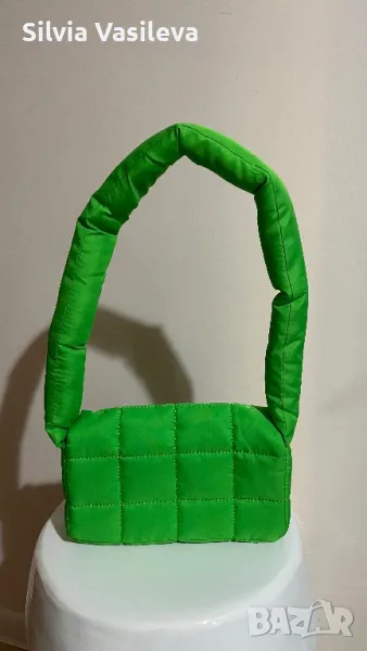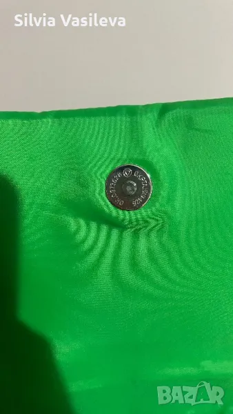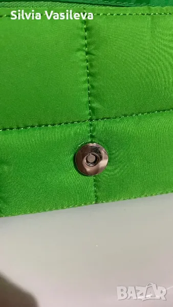 Зелена чанта H&M. Къса дръжка, става и за рамо. Вътрешен джоб с цип закопчава се с копче.