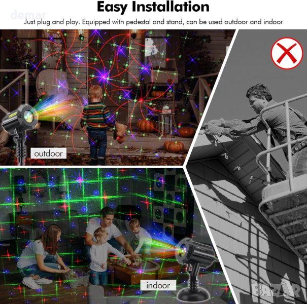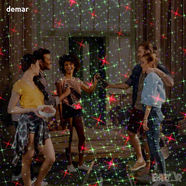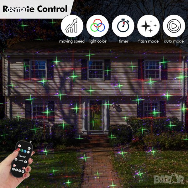 проектор е идеална за създаване на празнична атмосфера със своите сини, червени и зелени светещи точки, които проектират 8 непрекъснато движещи се шарки. Предлага се с дистанционно управление за лесно регулиране на скоростта на движение, цвета на светлината, настройките на таймера (2H, 4H, 6H, 8H) и избор между светкавица или автоматичен режим. Проекторът е безопасен със светлинен лъч по-малък от 1mw, което гарантира, че няма да навреди на хората. Инсталирането е лесно с функцията plug and play и включва пиедестал и стойка както за външна, така и за вътрешна употреба, с регулируеми ъгли на прожектиране за оптимални ефекти. Широкото му покритие го прави идеален за декорация на градина и дома, семейни партита, празнични събития, зали за танци и клубове.