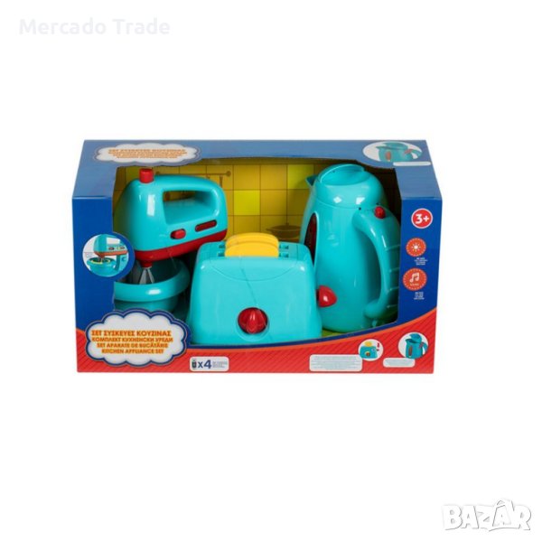 Игрален комплект с кухненски уреди. Разполага с миксер с въртяща се купа и бъркалки, тостер с 2 тоста и бутон за печенето им и кана с отварящ се капак.