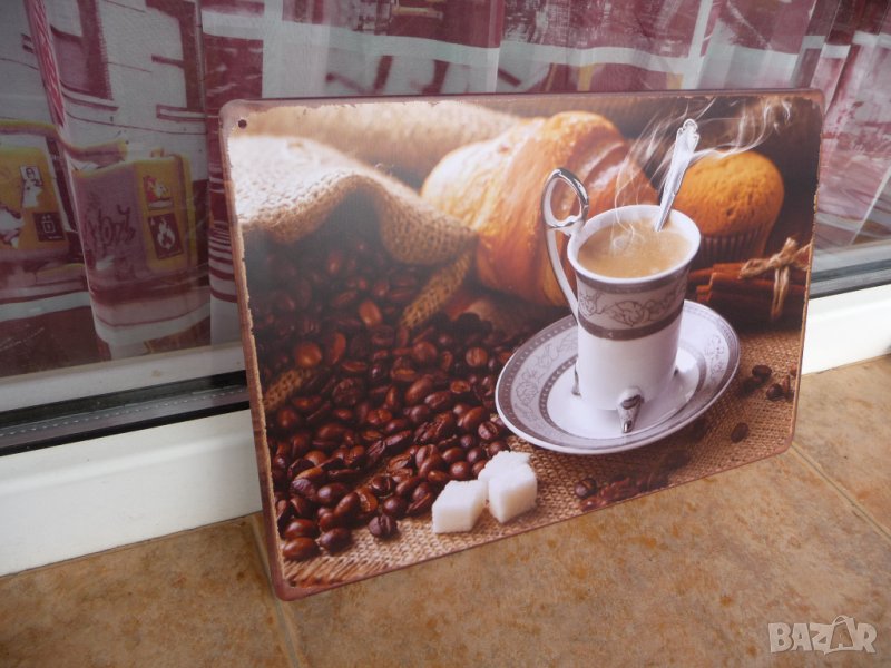 Метална ламаринена табела - Порцеланова чашка с кафе и кроасан.