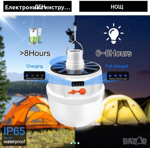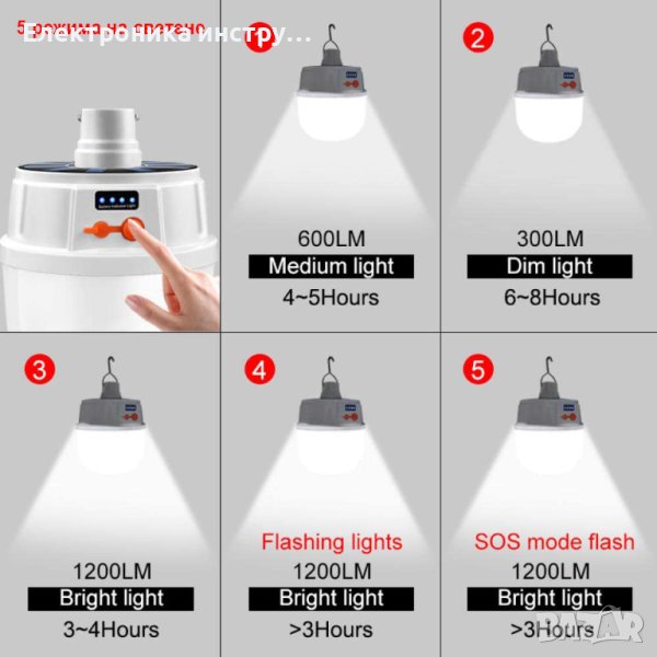 Къмпинг лампа с кука за закачане и 5 режима на светене. Мощна и удобна акумулаторна къмпинг LED лампа за закачане с вградени батерии и соларно зареждане през деня и USB кабел нощно време. Идеална е за къмпинг, за градина или ремонтни дейности.