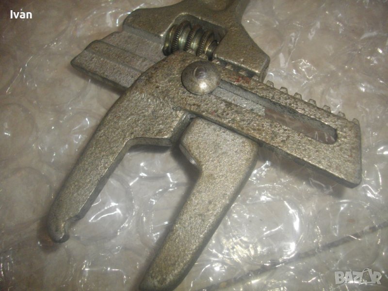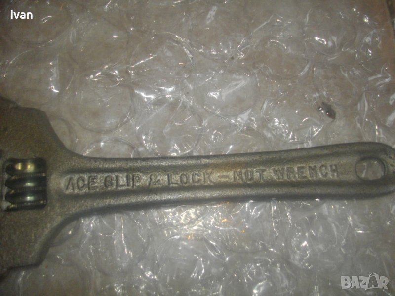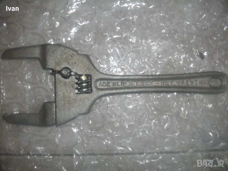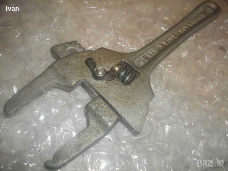 Ace Slip and Lock - Nut Wrench. Отлично техническо/работно състояние на инструмента. Стоперен винтов винт стяга за стопер на зададения режлаж на отваряне. Челюстите отварят за захват от 28 мм до 80 мм. Челюсти - издължени, с удължени рамена с дълочина на захват до 60 мм. Материал на ключа - стомана. Тегло на инструмента - 1,0 кг.