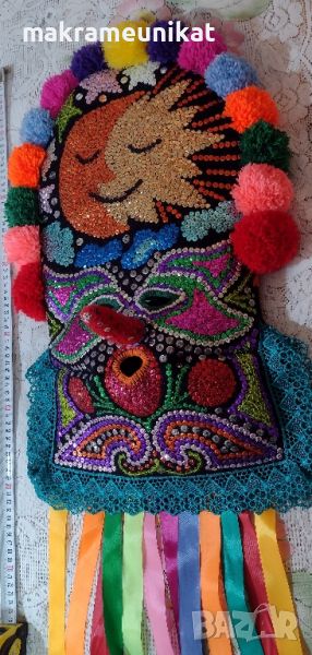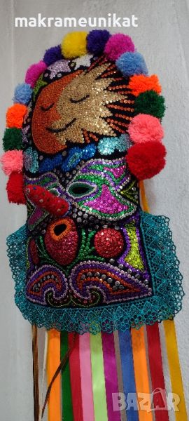 Върху автентичен плат шаяк от раклата на баба са здраво, двойно бродирани пайети, шарени, пъстроцветни, блещукащи и ефектни, отдалеч грабват окото. Декорация с панделки, помпони, ширити, гердани, всичко което си трябва за кукерски игри и маскарадни фестивали. За Сурва, Кукерландия, събори, и събития в традициите и обичаите на българите.
