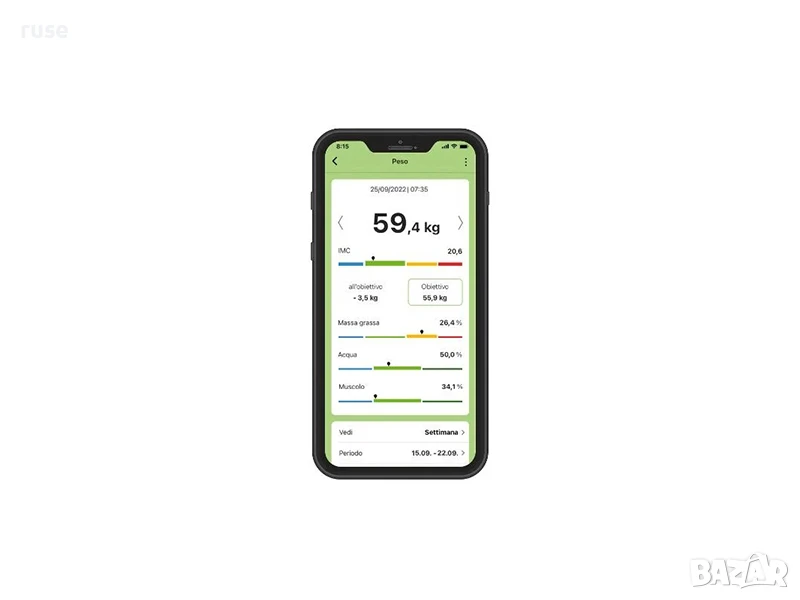 - За отчитане на телесно тегло, мазнини, вода, процент мускулна маса, костна маса и необходими калории