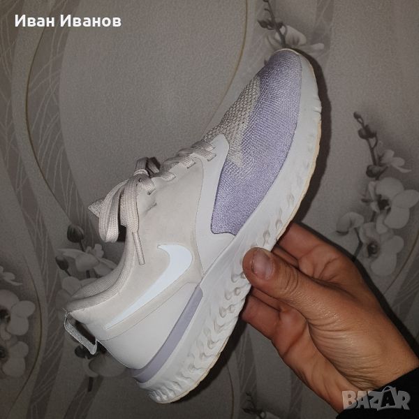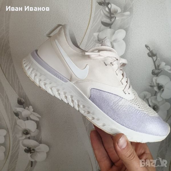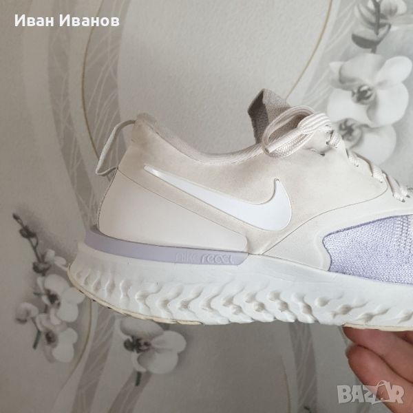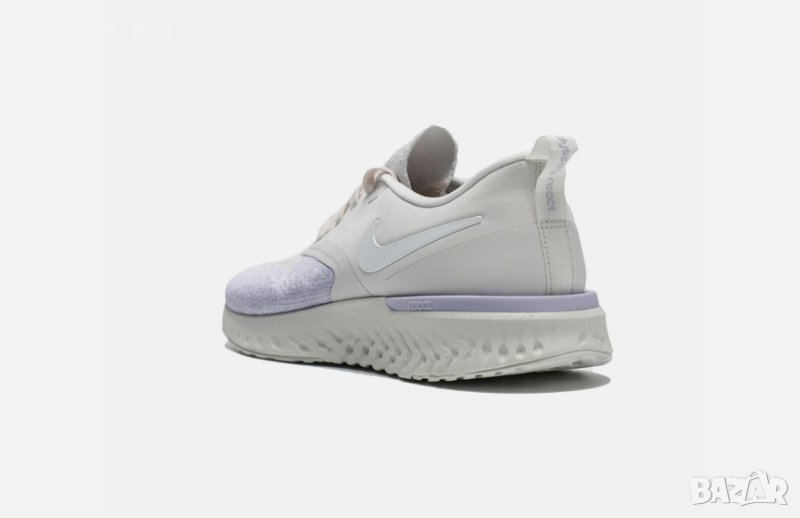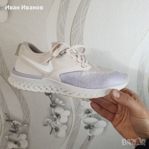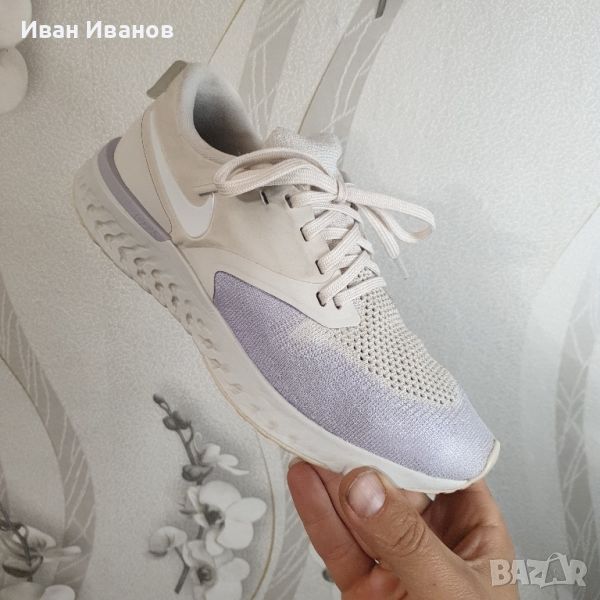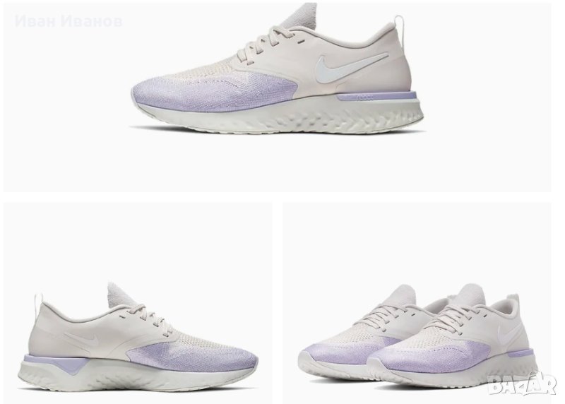 'Platinum Tint Lavender Mist' AH1016-005Използвани броени пъти , без следи и забележки Красиви , модерни , и удобни Дължина на стелката 25 см Дамските маратонки Nike Odyssey React Flyknit 2 осигуряват стратегическа комбинация от лек Flyknit и синтетичен материал за опора точно там, където имате нужда. Под краката, омекотяването на Nike React осигурява меко, еластично каране за маршрут, който иска да бъде смачкан. Показани: Платинен нюанс/Лавандулова мъгла/Бледа ванилия/Odyssey React Flyknit 2 -са удобни, неутрални обувки за бягане. Гъвкавата Flyknit горна част на обувките се адаптира към формата на краката и осигурява меко и стабилно прилягане. Обувките са много дишащи и осигуряват отлична опора. Горната част следва движението на краката ви и предлага много комфорт.Формованата пета е изработена от пяна, която обгръща удобно петата. Яката на обувката осигурява меко усещане на глезените. Материалът Nike React прави тези маратонки много отзивчиви. Материалът реагира на удар, като незабавно възвръща формата си. Така че колкото повече енергия влагате в стъпките си, толкова повече енергия ще си върнете. Външната подметка е преработена и сега разделя натиска върху краката по време на удар, като по този начин осигурява гъвкав преход от петата към пръстите.