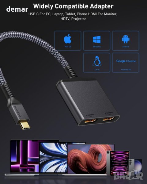 адаптера Maxonar 2-в-1 USB C към двоен HDMI 2.1. Този адаптер съчетава най-новите стандарти HDMI 2.1 с USB C, предоставяйки кристално чисти изображения на два дисплея едновременно. Насладете се на зашеметяваща 8K@60Hz или 4K@120Hz резолюция с HDCP 2.3, динамичен HDR и поддръжка на eARC. Двойният 4K@60Hz дисплей е идеален за многозадачност. Съвместим с Windows, macOS, Chrome OS и Android, този plug-and-play адаптер е лесен за използване. Просто се уверете, че вашият Type-C порт поддържа DP Alt Mode и сте готови да подобрите изживяването си при гледане.