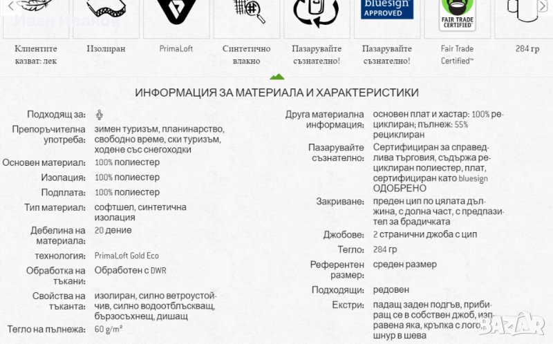 60-g PrimaLoft® Gold Insulation Eco 100% рециклиран полиестер след употреба с технология PURE™ (Произведено с помощта на намалени емисии) осигурява отлична топлина за теглото си, остава топло, когато е мокро и намалява въглеродните емисии в сравнение с конвенционалните производствени методи