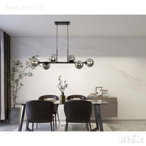 Дневната ще се преобрази с подчертана зона, светеща вечер и с модерен декоративен фокус през деня. Висящата таванна лампа грабва вниманието и печели симпатии, тъй като е едновременно модерна, интересна и подходяща за всеки интериор. Изработена е от черен метал и проектирана с 6 абажура от огледално стъкло, разположени асиметрично.