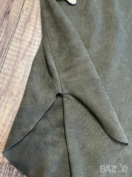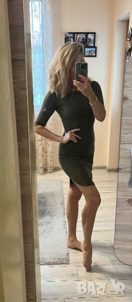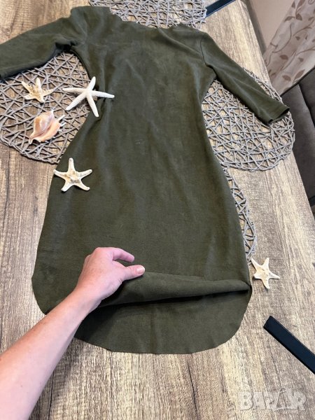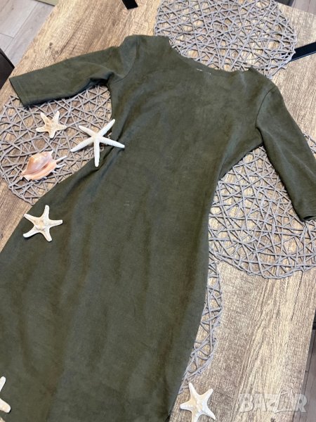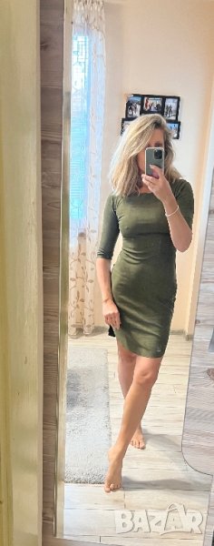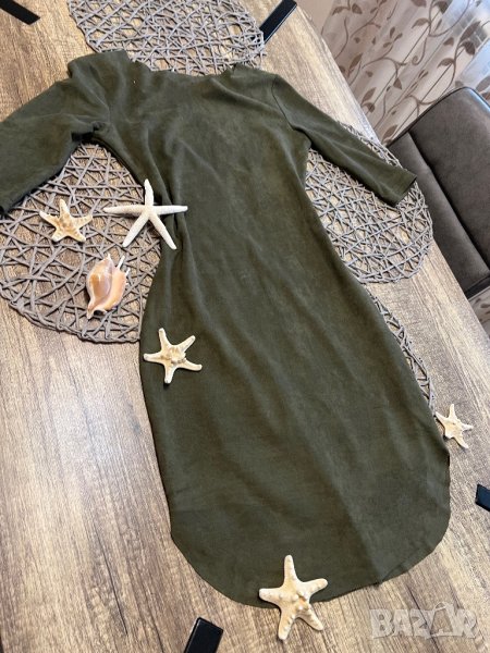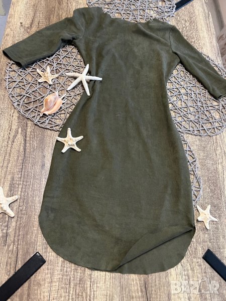 Роклята е в масленозелен цвят, мек велур. От едната страна има лека забележка, снимала съм отблизо. Има лека еластичност. Пише С-М размер, но си е С.