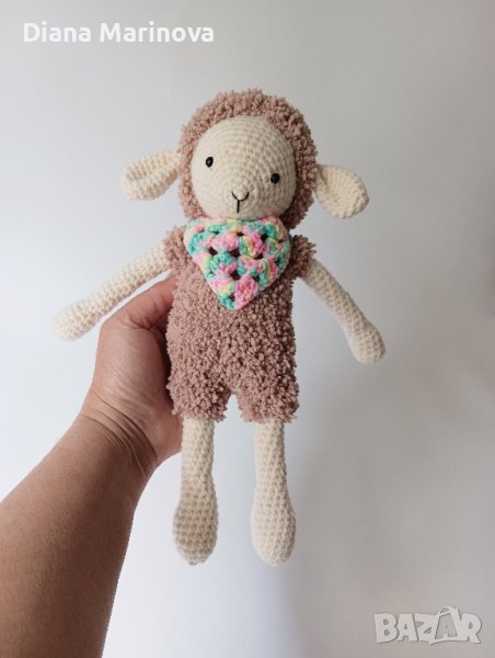 Цената е за един брой.Тези сладки агънца са ръчно изплетени на една кука от висококачествена мека прежда. Имат шалче, които може да се сваля. Подходящо е за подарък на деца над 5г. и за украса на интериора. Високо е 28см. Играчките са пълни със силиконов пълнеж, който е антиалергенен и безвреден за чувствителната бебешка кожа. Очичките са пластмасови safety-eyes и са безопасно прикрепени с винт,