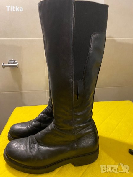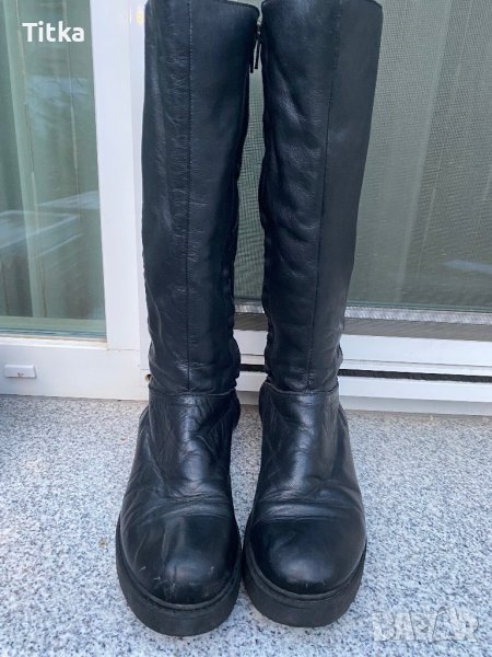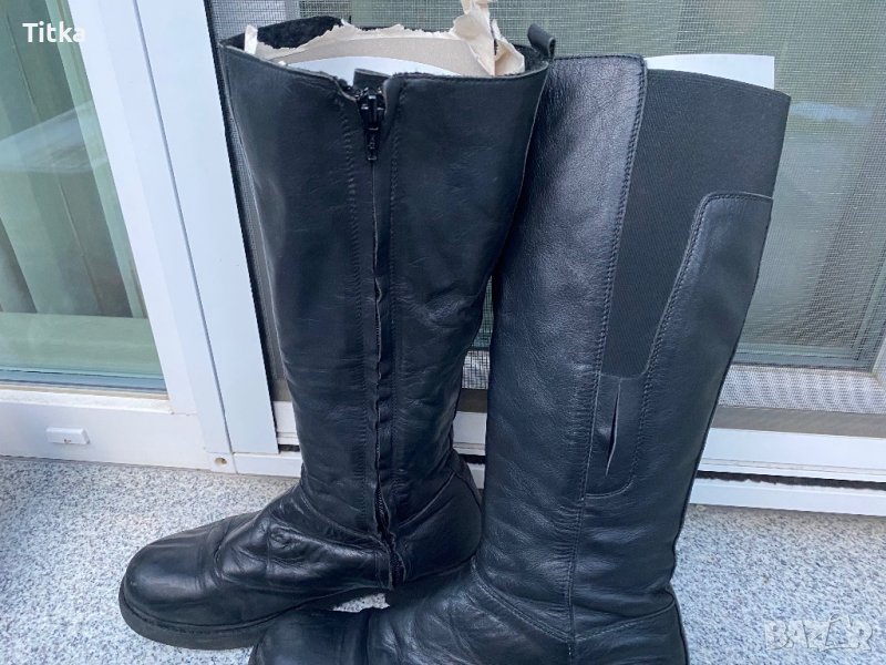 Високи ботуши естествена кожа, цвят - черен, ватирани от вътрешната страна, размер 38. Дължината на стелката е 25 см. Височина на ботуша 39 см, ширина в най-горната част 37см. Изключително запазени, като нови са.