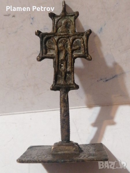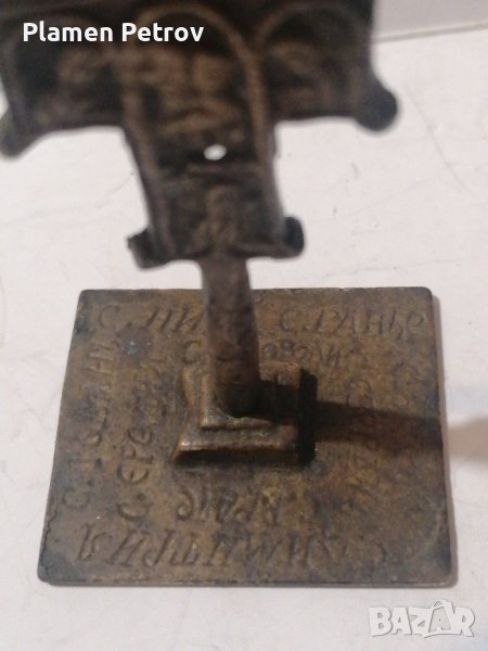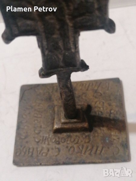 Стар бронзов кръст рядъкот края на 19 век с размери от височина 8 см и 4,5 /3,5 см на основата на, която са изписани имената на духовниците възрожденски, обреден кръст с печат
