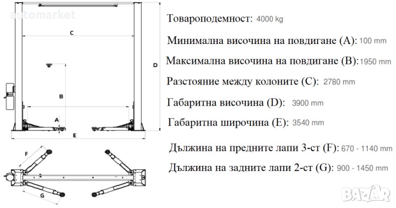 Товароподемност: 4000 кг. Подемниците са чисто нови! Конструкция от 18мм висококачествена стомана (на петите). Гарантирано най-добрата цена за нов такъв подемник в страната! Директен вносител на подемници от Европа. Ние сме единиственият вносител в страната, който предлага пълна гаранция от 24 месеца и реакция за сервиз и монтаж до 24 часа. Извънгаранционен сервиз на достъпни цени. Винаги налични подемници и части на склад! . Продават се в България повече от 30 години! Над 60 000 продадени и работещи подемника на територията на България, над 600 000 за цяла Европа. Изключително качество без компромис! Опция за изгоден лизинг. Ако намерите по-добра цена от тази в България, ще ви направим такава с 10% по евтина от намерената от вас.