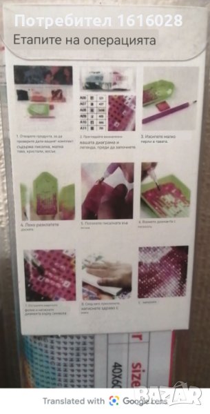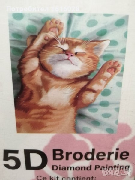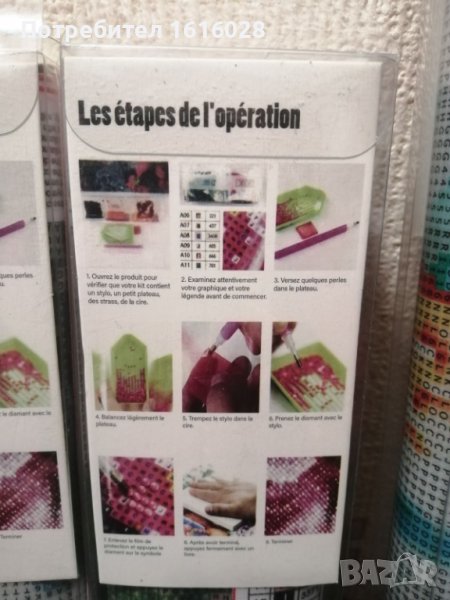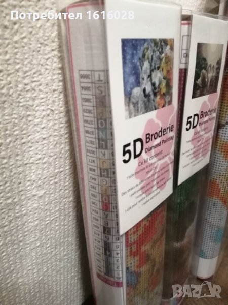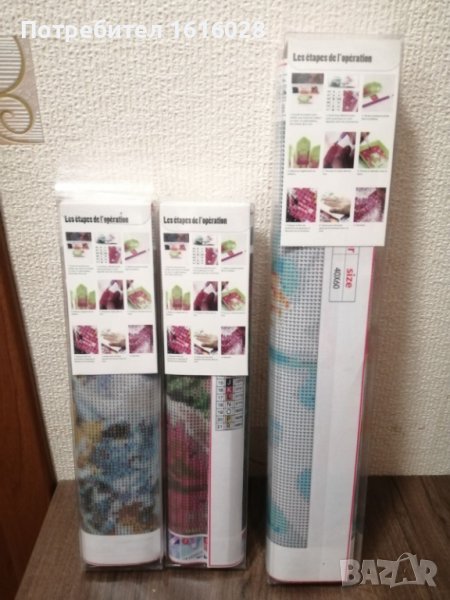 Три модела диамантени Гоблени.Във всеки комплект се съдържа по 1 отпечатано платно,стрази с различни цветове,1 малък поднос за подреждане на диаманчетата, 1 молив за хващане на диаманчетата,1 восък и 1 обяснителна бележка.Диамантчетата се подреждат на определените места,като се следват буквите,цифрите,знаците и цветовете отговарящи на тях.