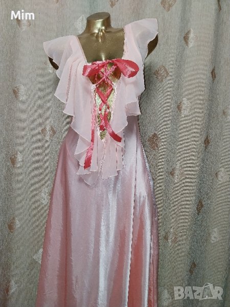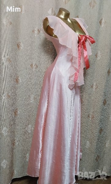 Сатенена, дълга нощница със сатенена лента на бюста за регулиране на размера по тялото, подгръдна 47 см едностранно, талия 45 см едностранно, ханш 65 см едностранно надолу е разкроена, дължина 145 см около деколтето е с воал / къдри / .Няма следи от употреба. Според мен ако се сложат синджир отпред на бюста с камъчета може да се използва за рокля .