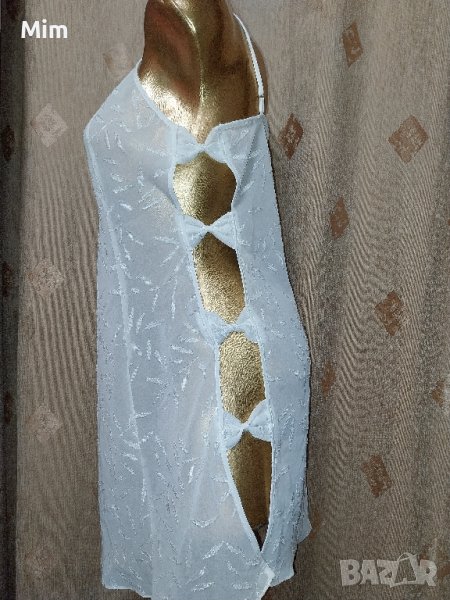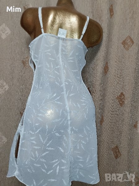Ефирна нощничка с релефни листа ,странично отворена съединена с пандели, регулируеми презрамки ,подгръдна 50 см едностранно, ханш 55 см едностранно, дължина от подмишници 65 см .Няма следи от употреба.