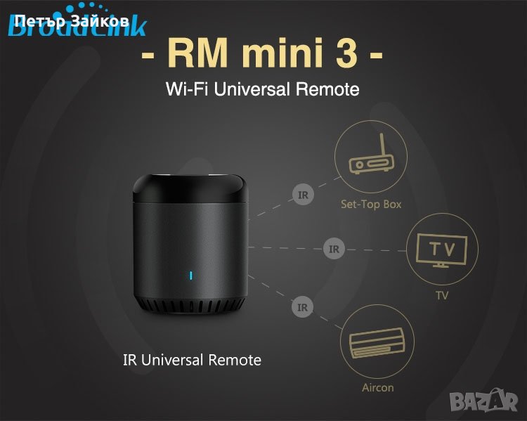 BroadLink RM Mini3 е универсално Wi-Fi дистанционно , чрез което може да се контролират домашните електроуреди през мобилен телефон или таблет. Работи с всички инфрачервени дистанционни (IR). Свързва се към домашната Wi-Fi мрежа, посредством Wi-Fi връзка, и Вие имате достъп по всяко време и от всяка точка на света Вие имате достъп и можа да управлявате вашите уреди посредством 3G или LTE мобилна връзка.