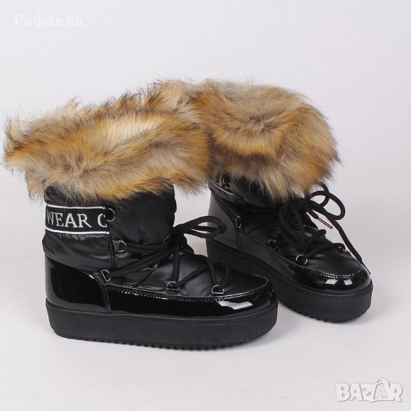 Изработени са от шушляков плат, който е непромокаем. Подметката е бяла, дебела, с грайфер, над нея са с лачена ивица от еко-кожа. Отпред са с връзки за регулиране на ширината около крака. Отвътре са подплатени с топла вата, за да се чувствате комфортно в студа. Практичен избор за ежедневието през зимния сезон.