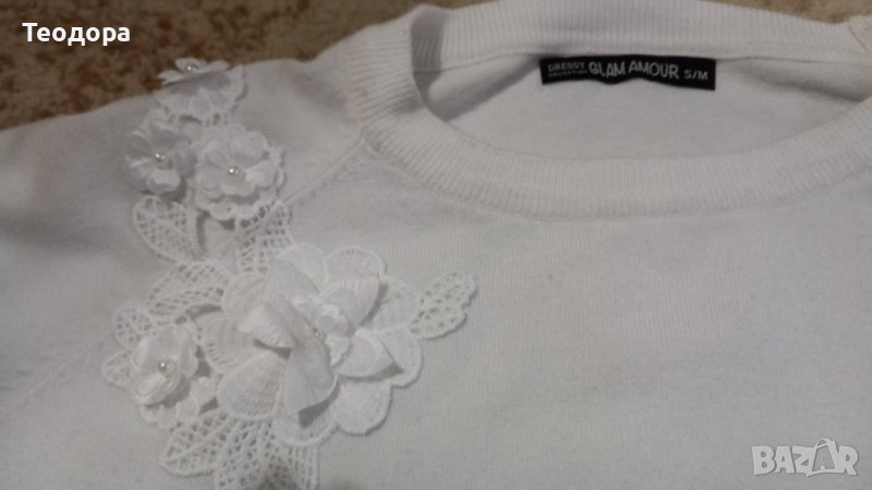 Много красива блуза от фино плетиво,декорирана с памучна дантела и 3 Д цветя.Размер С/М.Обличана е 2-3 пъти,като нова